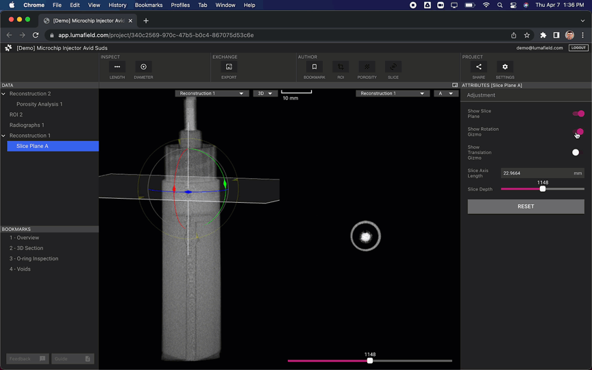 Custom Slice planes allow a user to define slice planes beyond X-Y-Z planes. A user would select the reconstruction or element that they want to place the slice plane on and select the slice tool. This will bring them to a view where the user can set up rotation and translation to focus on the feature of interest. The slider on the right window functions in the same way by allowing a user to navigate slicing through a particular part of a product. The axis length can also beadjusted for more granular control.