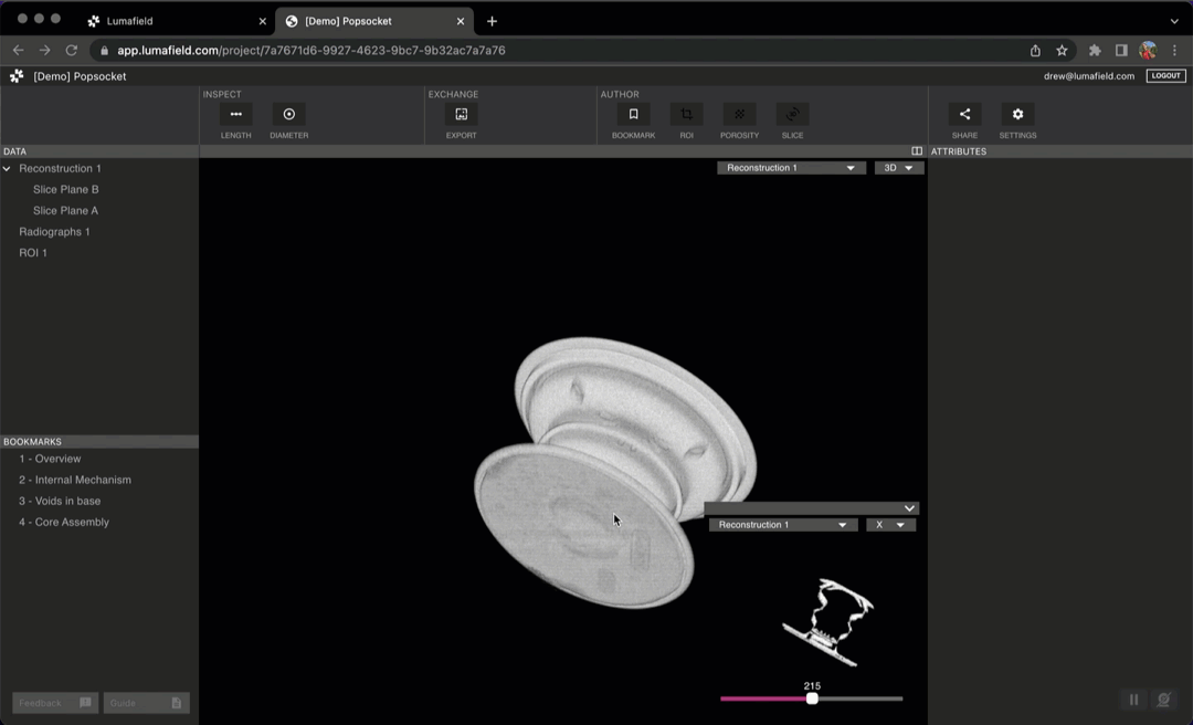 Voyager is Lumafield’s cloud-based inspection platform that runs directly in a web browser. It enables users to visualize, analyze, and share CT data from any computer, regardless of their location. It can be used to consolidate data from industrial CT scanners or 3D surface scanners.