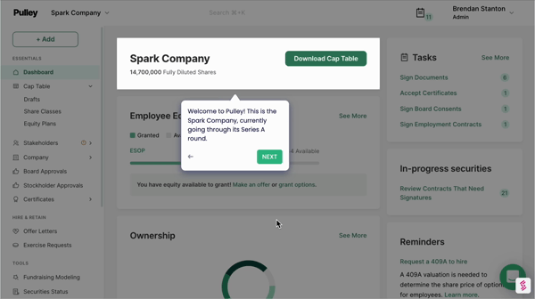 Pulley has a startup-focused product suite that provides cap table management, 409A valuations, fundraising modeling, and SAFEs, and unlike some of its competitors, electronic signatures can be completed on platform, with no need for third-party tools like DocuSign.