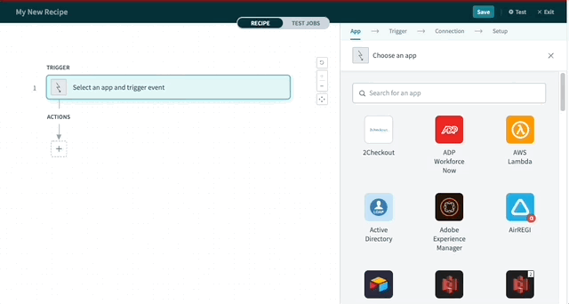 The fundamental building blocks of Workato’s platform are recipes, an automated workflow that executes a series of steps to integrate and process data across multiple applications. Every recipe includes a trigger that initiates the workflow (events that start the recipe) and one or more actions that execute when a trigger event occurs (tasks performed in response to triggers). Recipes use connectors to interact with different apps, ensuring seamless data flow across systems.